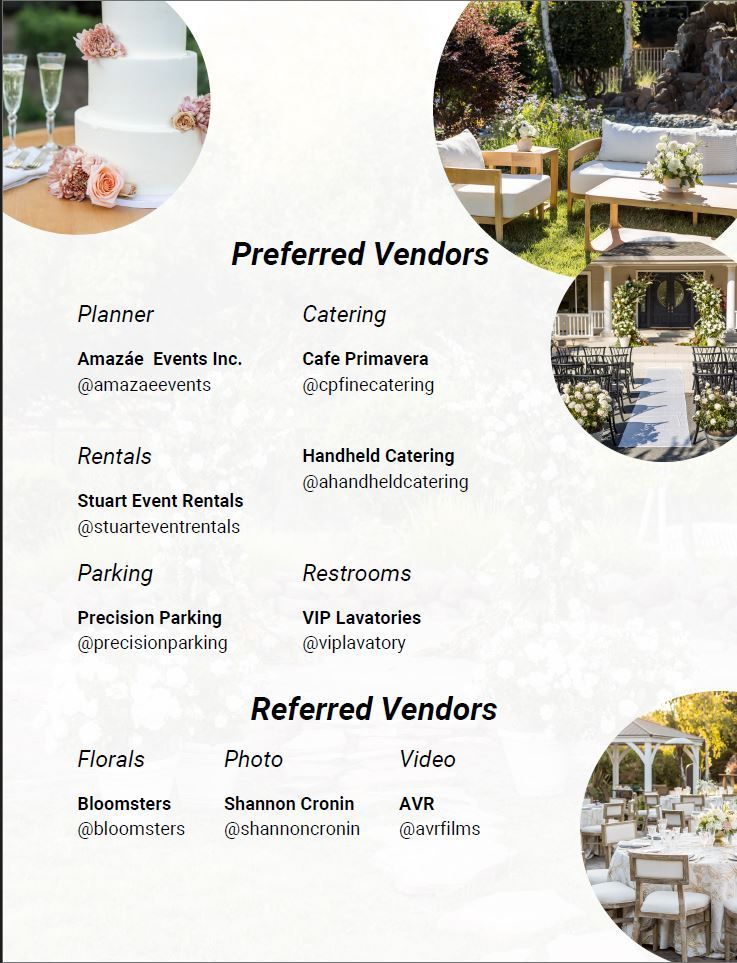 2. Do you provide a full event design and execution service? Yes, we have a dedicated professional - Amazae provides additional services as such: Full Event Design & Execution for $7,500, and Vendor Referral, Planning, and Management for $2,500. https://amazae.com